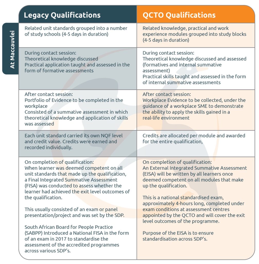 Legacy qualifications were designed in a unit-standard format, which covered theoretical knowledge, practical skills, and workplace application in an integrated manner. These qualifications, while comprehensive, were quite generic. The QCTO framework has refined this approach by structuring qualifications around specific occupations.